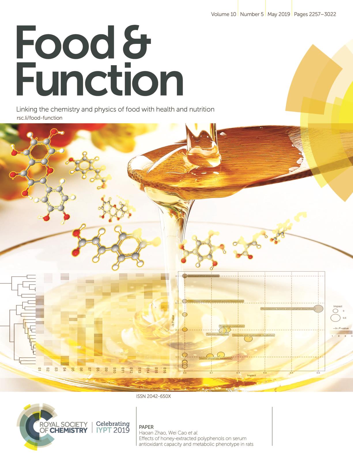 近日,pp电子官网曹炜教授学术团队在食品科学领域国际著名学术期刊《Food & Function》发表了题为《Effects of honey-extracted polyphenols on serum antioxidant capacity and metabolic phenotype in rats》的学术论文,并被邀选为该刊5月封面文章。该研究在国际上首次报道了中华蜜蜂蜂蜜的生物活性成分及其对机体代谢的健康益处。