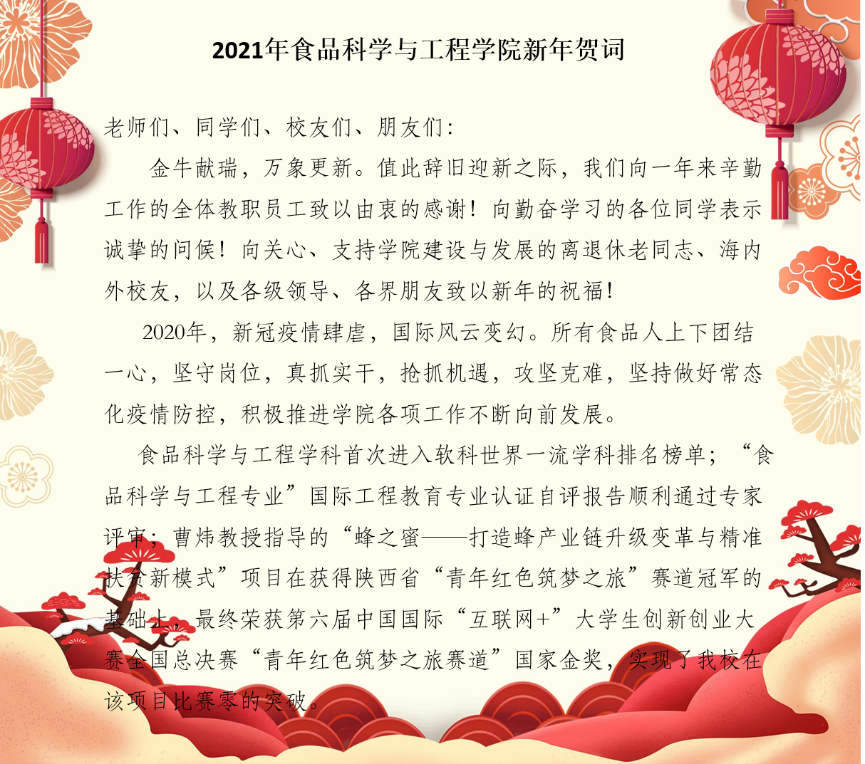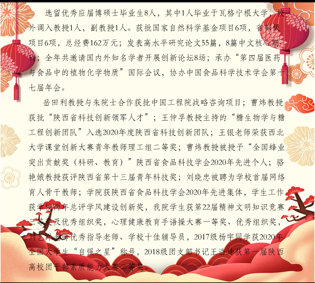 pp电子官方网站成立于2017年,是在2002年成立的pp电子官方网站化工学院食品工程系的基础上,汇集西北农林科技大学食品科学与工程、pp电子官方网站食品科学与工程、生命科学等相关专业的师资力量组建而成。学院现有二级学科博士点1个,一级学科硕士点1个,二级学科硕士点1个。 学院现有专职教师45人,其中教授9人,副教授21人,讲师15人,100%的教师具有博士学位,80%的教师有海外留学经历。教师队伍中有原国务院学位委员会学科评议组专家1人,享受国务院特殊津贴专家1人,教育部新世纪人才2人,陕西省“三五”人才1人,陕西省科技创新领军人才2人和陕西青年科技奖获得者2人。学院拥有“朱蓓薇院士工作站”、“陕西省食品安全风险识别控制技术研究中心”、“陕西省营养健康食品个性制造工程实验室”、“陕西省食品安全与营养健康创新转化平台”和“陕西省蜂产品工程技术研究中心”、“陕西省天然多糖资源利用工程研究中心”等科研平台...
