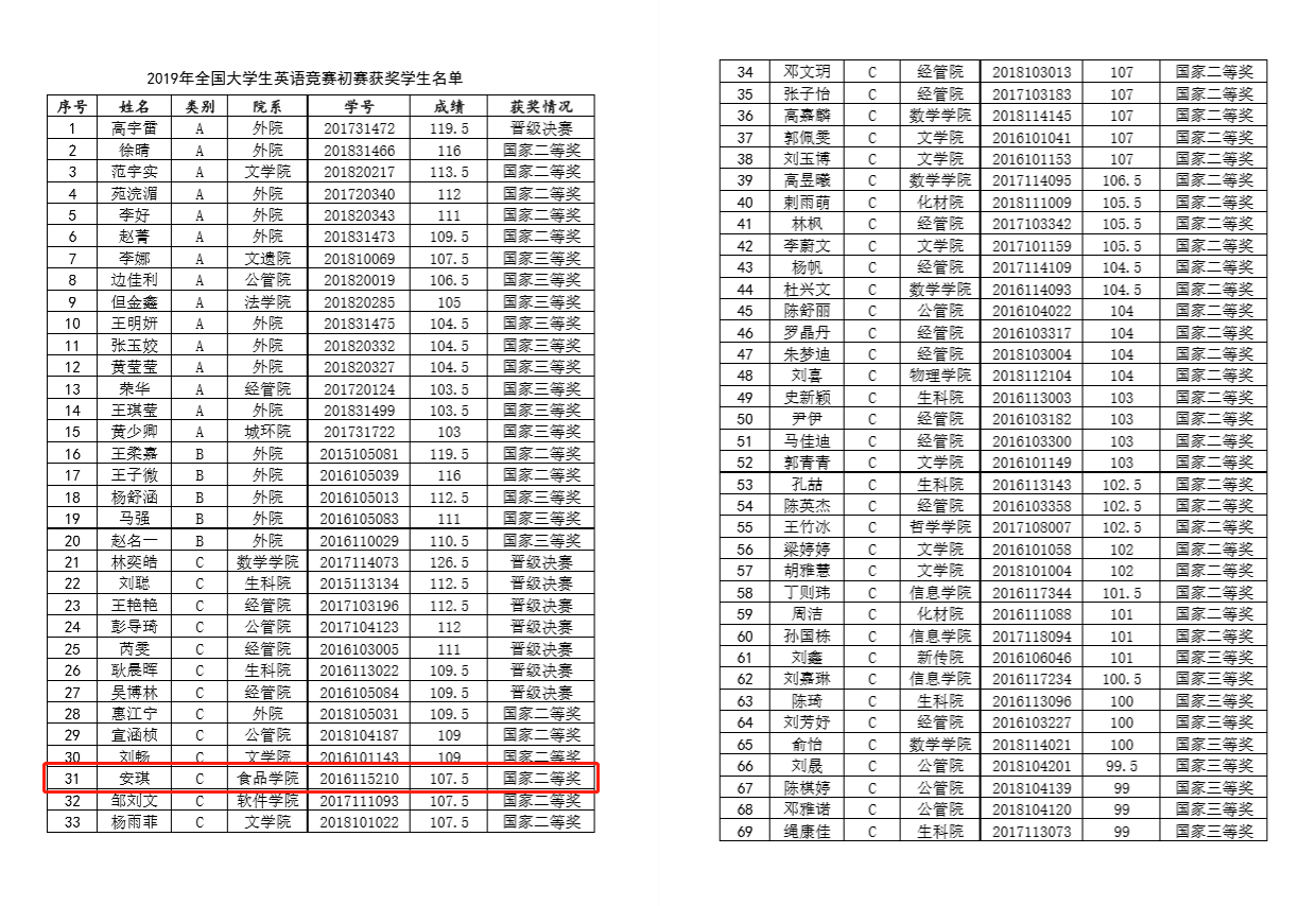 4月14日,2019年全国大学生英语竞赛初赛在pp电子官网举行。按照全国竞赛组委会的工作要求和评分标准,学校组织专业教师团队,集中、封闭、流水阅卷,汇总并公布了初赛成绩及获奖学生名单,本次初赛pp电子官网共有114人获奖。其中晋级决赛8人,国家二等奖41人,国家三等奖65人。pp电子官网2016级安琪同学荣获2019年全国大学生英语竞赛初赛二等奖。