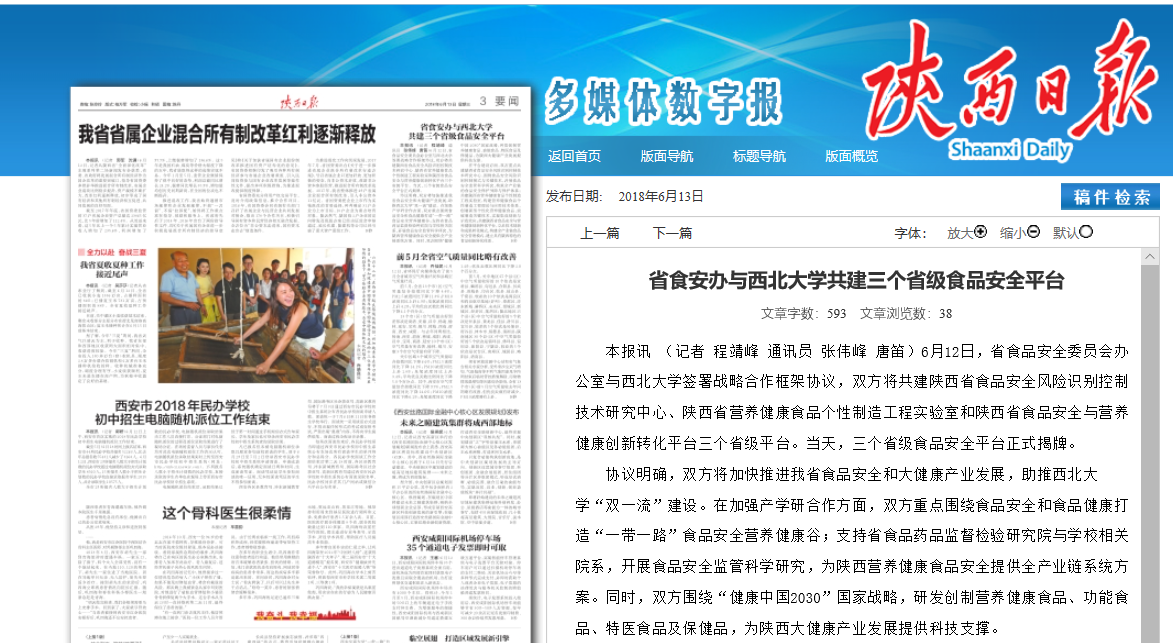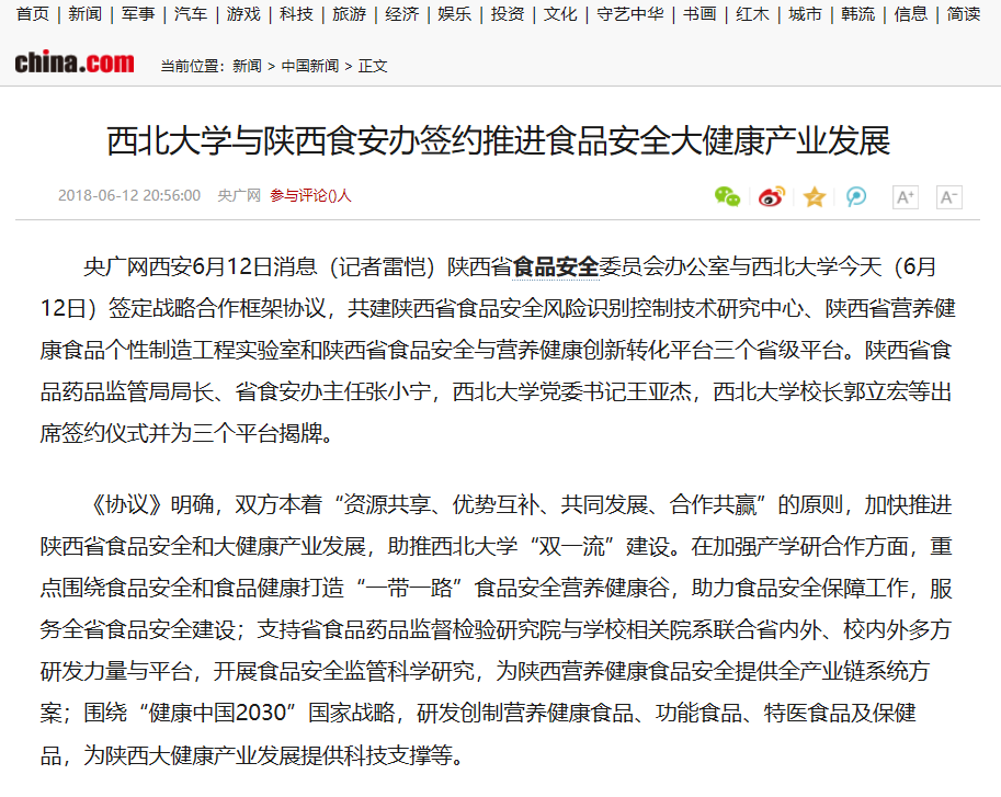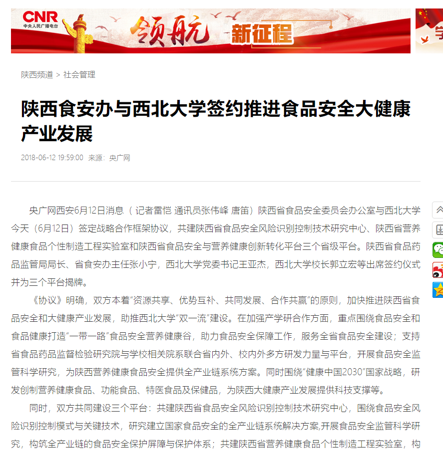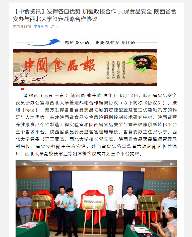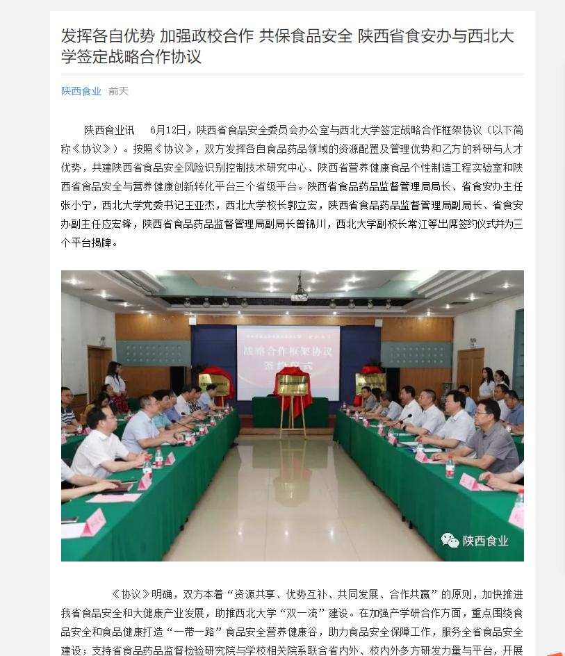 6月12日下午,陕西省食品安全委员会办公室与pp电子官网战略合作框架协议签约仪式在太白校区举行。双方共建陕西省食品安全风险识别控制技术研究中心、陕西省营养健康食品个性制造工程实验室和陕西省食品安全与营养健康创新转化平台三个省级平台。