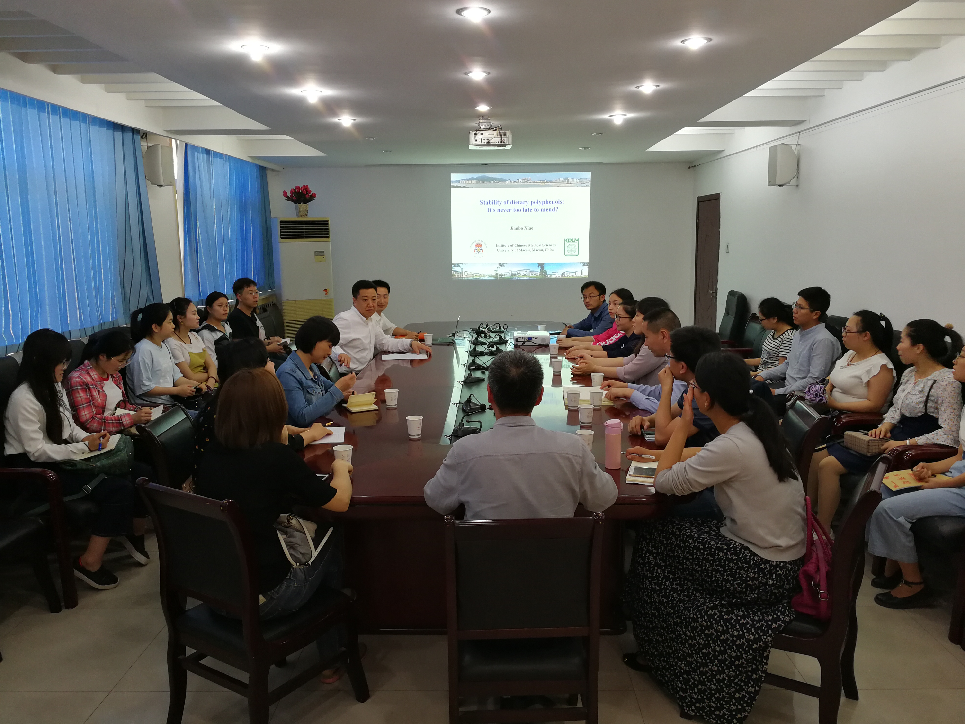 5月3日下午,澳门大学萧建波教授应邀来pp电子官网,作题为《Stability of dietary polyphenols :It’s never too late to mend》的学术报告,该报告也是pp电子官方网站创新论坛第294讲,pp电子官网全体教师和部分研究生参加。报告会由岳田利院长主持。