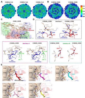 近日,pp电子官方网站糖工程中心联合香港城市大学、中国疾病预防与控制中心、南方科技大学等多家单位在国际期刊 PNAS 上发表了题为 Molecular Basis of Differential Receptor Usage for Naturally-occurring CD55-binding and -nonbinding Coxsackievirus B3 Strains,该论文首次提供了肠道病毒差异性受体利用的分子基础,为阐释肠道病毒实现从 “单受体利用”到“双受体利用”的进化机制提供重要的数据。 肠道病毒感染是常见的新生儿期感染性疾病病因之一,近年来,肠道病毒已造成全球地区婴幼儿手足口病的多次流行,患儿除了表现为发热、手足皮肤及口腔黏膜等部位典型疱疹外,还可导致新生儿和青少年病毒性肌炎,脑膜炎等疾病,甚至死亡。每年由肠道病毒引起的感染已超过 30 亿人次,严重威胁人类健康。 细胞表面的受体是病毒入侵的“门户”,受体的使用决定了病毒感染细胞嗜性,并与病毒的致病性有关。研究表明,肠道病毒通常利用双受体系统(黏附受体和脱衣壳受体)进入宿主细胞引起感染(Cell,2019,177: 1553-1565),然而,有些肠道病毒毒株仅利用单个的双功能受体完成入侵过程(PNAS, 2020, 117: 18711-18718 )。深入了解肠道病毒差异性受体利用分子机制不仅对病毒的致病机制、疫苗及药物研发至关重要,而且为临床上由肠道病毒引起感染的精准化治疗提供指导意义。然而,肠道病毒差异性受体利用的分子机制尚不明晰。肠道病毒柯萨奇 B3(Coxsackievirus B3, CVB3)是引起全球心肌炎的主要病原体。研究人员基于 NCBI 数据库 CVB3 毒株序列,结合从全国各地 6 岁以下儿童临床病例筛分的毒株序列分析发现,CVB3 核衣壳蛋白 VP3-234 位点的氨基酸呈现多态性的特点,此位点共出现五种不同的氨基酸(VP3-234Q/N/V/D/E),随后研究人员通过体外的生化试验及进化分析,证实 VP3-234 位点氨基酸的不同决定了病毒与黏附受体 CD55 结合的特异性/亲和性。为进一步阐释病毒差异性受体的入侵机制,研究人员利用冷冻电镜技术,分别解析了不同病毒毒株与黏附受体 CD55、脱衣壳受体 CAR 在不同入侵阶段不同 pH 下的高分辨率复合物结构,首次在近原子水平上提供了肠道病毒差异性受体利用的结构基础。同时,研究人员基于结构信息及体外的生化实验,提出不同 CVB3 毒株虽然利用相同的脱衣壳受体,其感染机制却存在 pH 偏好性差异的入侵模式。以上研究,不仅丰富肠道病毒入侵机制,也从分子水平上提供了受体利用中肠道病毒如何从“单受体”到“双受体”进化过程的结构基础。 pp电子官方网站青年教师王庆玲、中国疾病与预防控制中心杨倩、南方科技大学博士后刘聪聪为本论文的第一作者,高福院士为论文的通讯作者,该研究得到中国科学院微生物研究所齐建勋研究员、香港城市大学杨梦甦教授、pp电子官方网站糖工程中心王仲孚教授的支持。