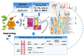 胰岛素抵抗(IR)是代谢综合征的核心,富含单糖的饮食是诱发IR的重要因素。为了探究蜂蜜与等量糖水饮食对IR的影响,我们基于LC-MS和硅烷衍生化/GC-MS分析了枣花蜜和油菜蜜中的酚类物质和寡糖组成,并通过对SD大鼠进行果糖、果糖+葡萄糖和两种单花蜂蜜(高/低剂量)的等量糖干预,比较了不同含糖饮食对大鼠血糖稳态、血脂水平、组织病理学、IR相关信号通路和肠道菌群组成的影响。结果表明,蜂蜜不同于糖水,特别是17.1 g/kg体重的枣花蜜富含酚类物质(如异槲皮素1.971 mg/100 g)和低聚糖(如松二糖2.18 g/100 g)成分,可维持葡萄糖稳态(OGTT和ITT)和脂质(TC、TG、LDL-C、HDL-C和NEFA)平衡,能有效改善肝脏、脂肪和骨骼肌组织结构异常,减少氧化应激(GSH-Px和MDA)和炎症(IL-6和TNF-α),调节NF-κB和IRS/PI3K/AKT信号通路,并重塑肠道微生态,减少Oscillospira等有害菌,增加Bifidobacterium等有益菌,实现对代谢途径的调节。该研究揭示了膳食中用蜂蜜代替单糖的潜在营养贡献,为通过膳食调整控制IR发展提供了理论依据。