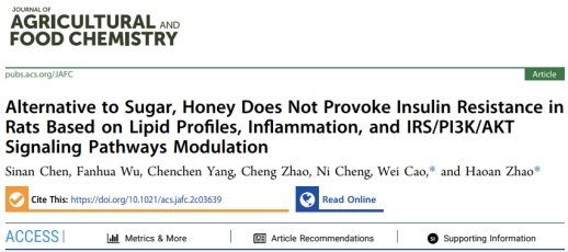 本研究基于曹炜教授团队多年在蜂蜜成分及活性研究领域的工作基础,相关成果以“Alternative to Sugar, Honey Does Not Provoke Insulin Resistance in Rats Based on Lipid Profiles, Inflammation, and IRS/PI3K/AKT Signaling Pathways Modulation”发表在食品科技领域顶级期刊《Journal of Agricultural and Food Chemistry》(中科院1区 TOP, Q1区,影响因子5.895)。该论文的第一作者为博士生陈思南,通讯作者为曹炜教授和赵浩安副教授。研究工作得到了国家自然科学基金(31871876、31901786)、陕西省高层次人才专项支持计划(TZ0389)和陕西省科技计划(2022FP-12、2022FP-14)的资金支持。