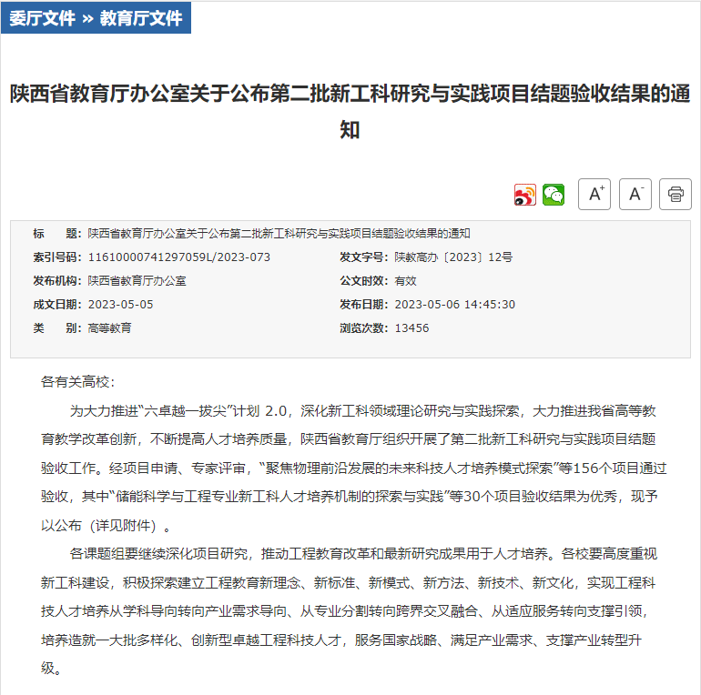 5月5日,陕西省教育厅发布了《陕西省教育厅办公室关于公布第二批新工科研究与实践项目结题验收结果的通知》(陕教高办〔2023〕12号),由pp电子官网曹炜教授主持,吕新刚、高慧、程妮、欧建东、张颖、曹悦、刘茜、刘清清、何亮亮等老师参加的“基于“云工坊”模式的食品学科产教融合创新实践平台建设探索与实践”项目顺利通过结题验收。