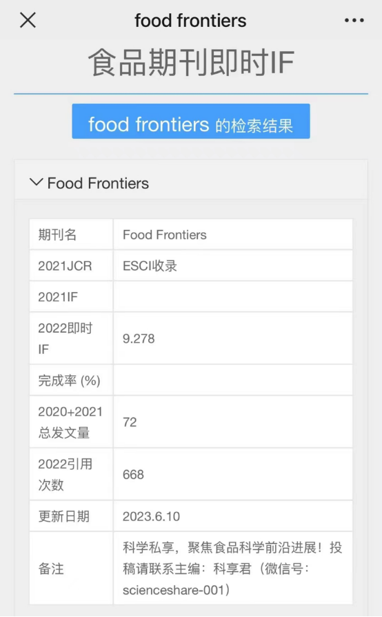 2023年,《Food Frontiers》正式被ESCI (Emerging Sources Citation Index)数据库收录,并获得首个影响因子。自2020年1月创刊以来发表的所有论文都被《Web of Scienc》收录,为食品学科发展和国际科研交流与合作提供重要支撑。