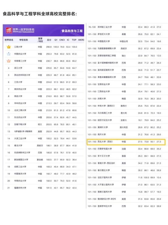 10月27日,高等教育评价专业机构软科发布2023“软科世界一流学科排名”(Shanghai Ranking's Global Ranking of Academic Subjects)。2023年pp电子官网食品科学与工程学科进入全球前101-150名,取得了比2022年全球前151-200名更好的发展态势。此外以食品科学与工程学科为核心支撑的农学学科世界排名由2022年位于301-400之间上升至今年201-300之间。