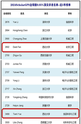 pp电子官网岳田利教授、樊君教授入选ScholarGPS “2024年全球前0.05%顶尖学者榜单”