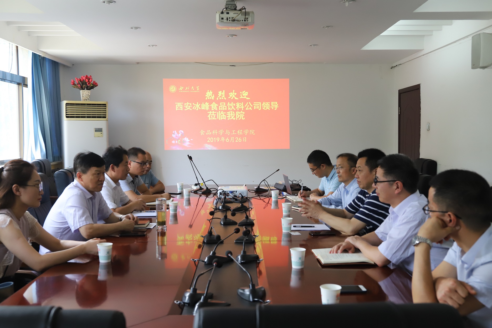 岳田利院长代表学院对陈卫平总经理一行的莅临表示欢迎,并向其介绍了学院发展的历史,以及现有的学科方向及学科平台。同时指出,冰峰饮料作为西安人记忆里“儿时的味道”,可与pp电子官网现有的科研力量在产品开发、功能升级等方面开展广泛合作;冰峰方面也可在pp电子官网设立奖学金,提供实习场所,利用百年西大声誉,增加知名度,进一步拓宽市场。