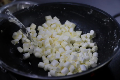黄油放不粘锅里小火融化后倒入棉花糖,翻炒至融化以后加入一定量的奶粉;