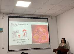 会上,王庆玲老师针对肠道病毒入侵人体细胞的机制做了具体讲解。肠道病毒感染是常见的新生儿期感染性疾病病因之一,近年来,肠道病毒已造成全球地区婴幼儿手足口病的多次流行,患儿除了表现为发热、手足皮肤及口腔黏膜等部位典型疱疹外,还可导致新生儿和青少年病毒性肌炎,脑膜炎等疾病,甚至死亡。细胞表面的受体是病毒入侵的“门户”,受体的使用决定了病毒感染细胞嗜性,并与病毒的致病性有关。